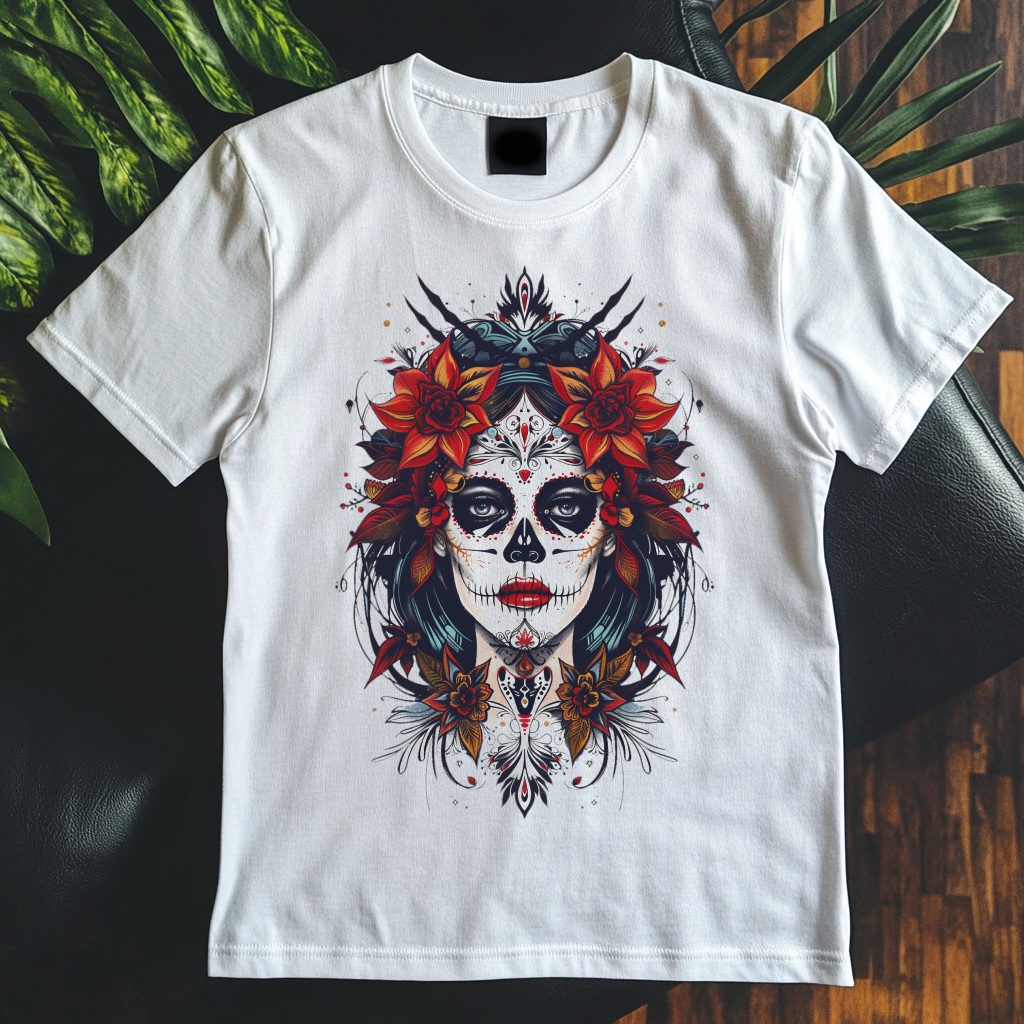 Ve stínu mexických ulic se zjevuje El Muerte, strážce hranic mezi životem a smrtí. Toto tričko je klíčem do světa, kde se setkávají oslavy a smutek, krása a destrukce. Oblečte se do této zbroje smrti a připravte se na cestu s El Muerte, který tančí mezi světy a nese s sebou poselství o přirozenosti proměny a cyklu života. Lebka, kostra nebo makeup?