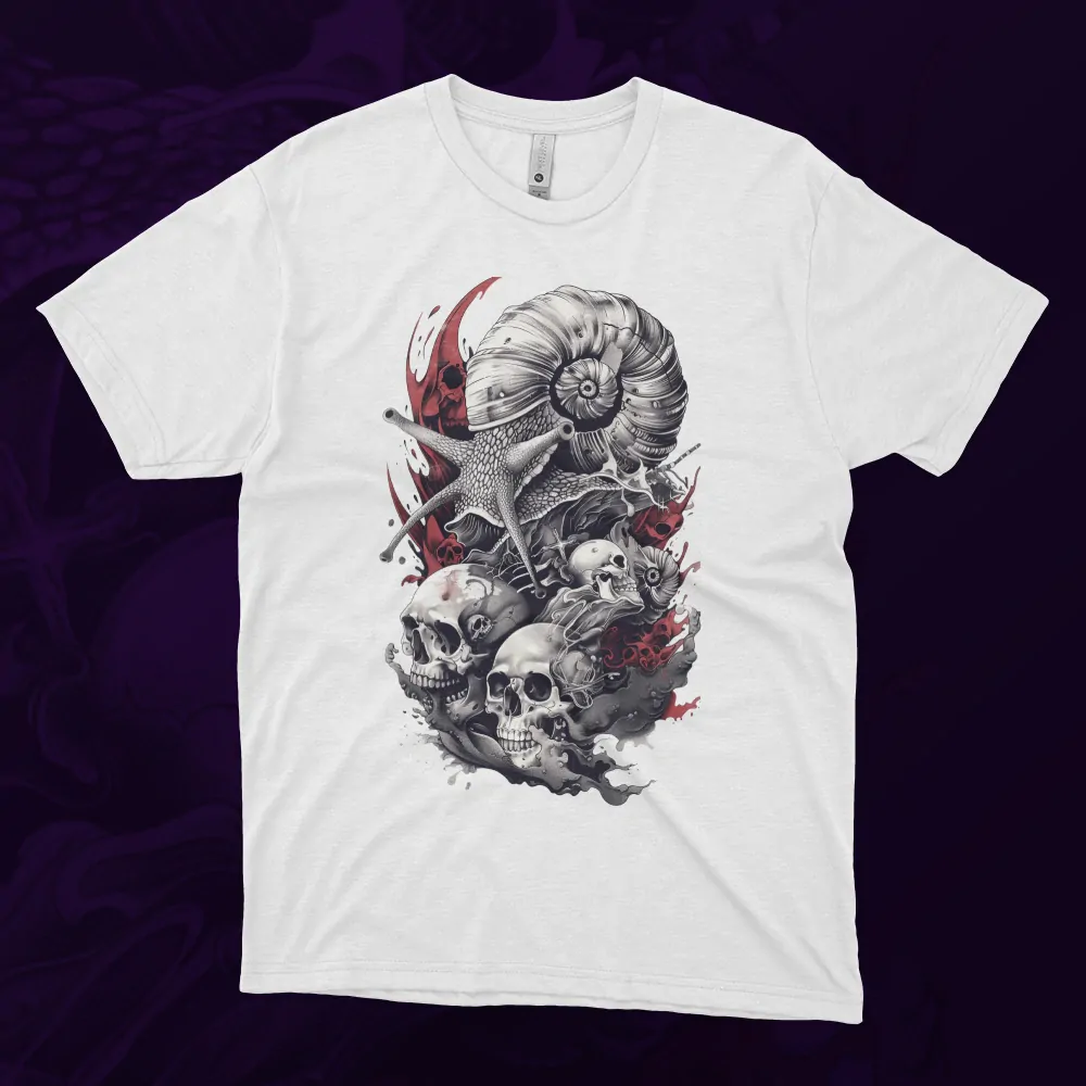 V temných a tajemných lesích se majestátně pohybuje Lord Snail, jehož pomalý a uvážený krok nese starodávnou moudrost. Toto tričko vás zavede do světa, kde se stýkají trpělivost a síla, kde Lord Snail vládne svému království s klidem a elegancí. Oblečte se do této zbroje a připravte se na cestu, kde vás provede Lord Snail skrze tajemné krajiny plné nečekaných zázraků. Temný motiv, kde se propojuje lebka, tajemný šnek a symbolika smrt, vytváří originální a lehce surrealistickou atmosféru. Design spojuje motiv pomíjivosti, přírody a temné estetiky, kde lebky připomínají nevyhnutelnost smrti.