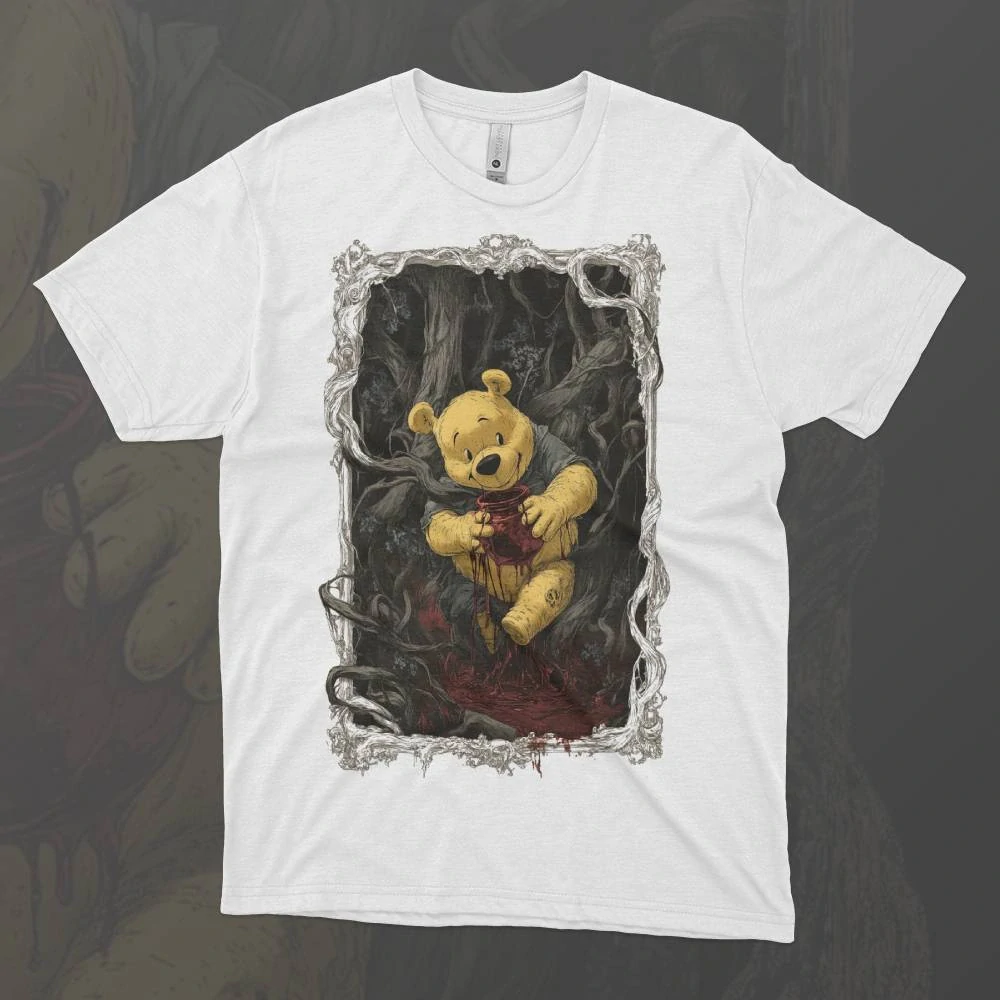 Medvídek Pú – Krvavé Pohrdání je tričko, které zobrazuje temnou a zvrácenou verzi klasického pohádkového světa. Medvídek Pú, původně nevinný a přátelský medvídek, se zde proměňuje v záhadného a nebezpečného tvora, jehož pohled skrývá zlost a pohrdání. Krvavé stopy a temné pozadí podtrhují drsný kontrast mezi původní roztomilostí a nebezpečnou hrozbou, která je nyní součástí jeho světa.