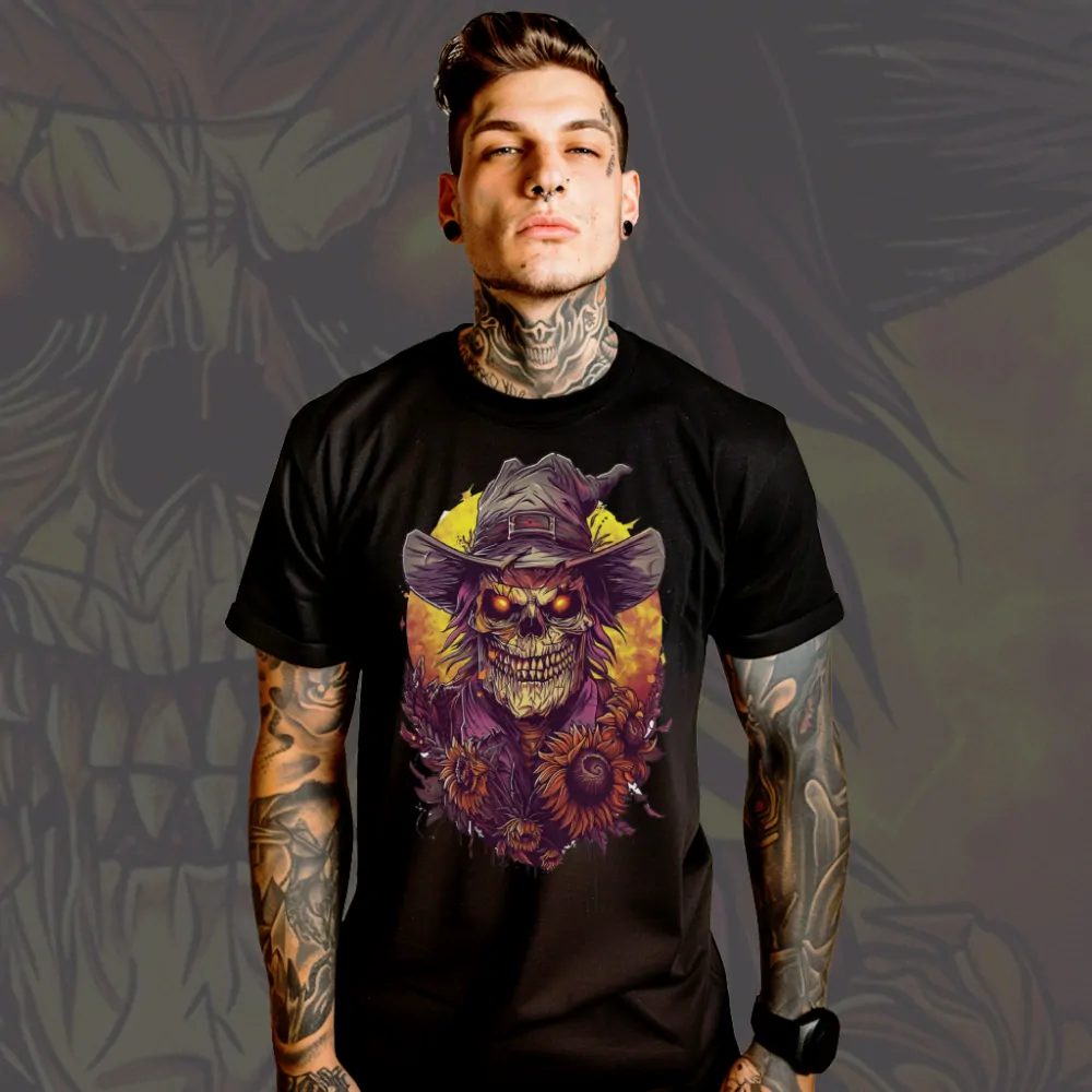 V prostředí zapomenutých polí stojí Mysterious Scarecrow, jehož figurína zchátralá časem skrývá tajemství, jež se zahalují v závoji tmy. Když noční větry zašustí mezi kukuřičnými stonky, jeho přítomnost vzbuzuje v duších strach i zvědavost, co se skrývá za jeho němým pohledem a věčným klidem. Tenhle strašák nesmí chybět ve vašem šatníku. Strašidelná lebka v klobouku strašáka vytváří výrazný horror motiv inspirovaný temnou atmosférou podzimu a tajemnými nocemi na opuštěných polích. Tento design spojuje děsivou estetiku, strašidelnou symboliku a temný styl, který zaujme všechny milovníky horror motivů.