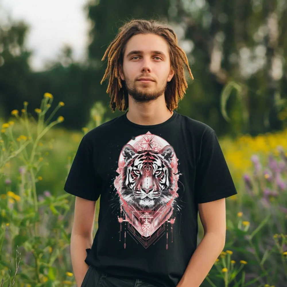 Fantasmální tygr je symbolem síly a tajemství. Toto tričko vypráví příběh tygra, který se objevuje v prastarých džunglích jen za svitu měsíce, kdy se ztrácí hranice mezi realitou a snem. Jeho pruhy září jako magické runy a jeho oči prozrazují moudrost získanou za nesčetné generace. Tygrova přítomnost je cítit všude kolem, i když ho málokdo spatří. Když si obléknete toto tričko, budete cítit sílu a mystickou energii fantasmálního tygra. Geometrické tvary na tričku zdůrazňují jeho snovou auru a moc. Tričko je nejen stylové, ale také přináší ducha divočiny a mystiky fantasmálního tygra. Ukažte světu svou odvahu a spojení s tajemným světem s tímto jedinečným trikem!