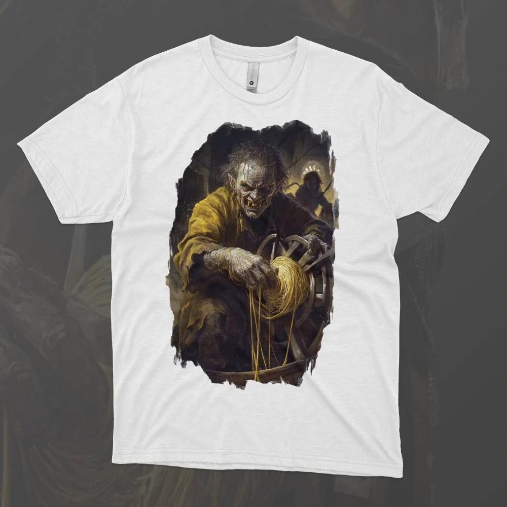 Rumpelstiltskin – Mistr Temných Úmluv přináší obraz postavy, která ovládá umění uzavírání nebezpečných a zrádných dohod. Tento design zobrazuje Rumpelstiltskina jako mistrného manipulátora, který používá temné síly k tomu, aby ovládl osudy těch, kdo se s ním spojí. Záhadné symboly a mystické detaily na tričku odrážejí jeho schopnost vyjednávat a měnit pravidla, čímž vytváří atmosféru napětí a nebezpečí. Každý detail podtrhuje moc, kterou tento temný pakt přináší, a zanechává diváka s pocitem nevyhnutelné zkázy.