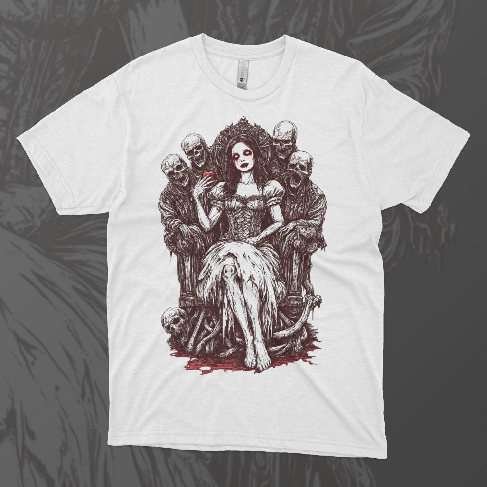 Sněhurka – Krvavá Královna přináší na tričko temnou interpretaci pohádky, kde zlá královna vystupuje v plné síle své moci a nenávisti. S jejími krvavými ambicemi a touhou po nesmrtelnosti, královna zůstává v srdci pohádky symbolem zla a manipulace. Design se zaměřuje na její zlověstnou podobu, kde dominantní červené odstíny a temné pozadí kontrastují s jejími studenými, vyhrocenými rysy. Tričko vyjadřuje nejen její vnější krásu, ale i nebezpečí, které její krutá povaha přináší, a je připomínkou, že pod maskou dokonalosti se může skrývat temná síla.
