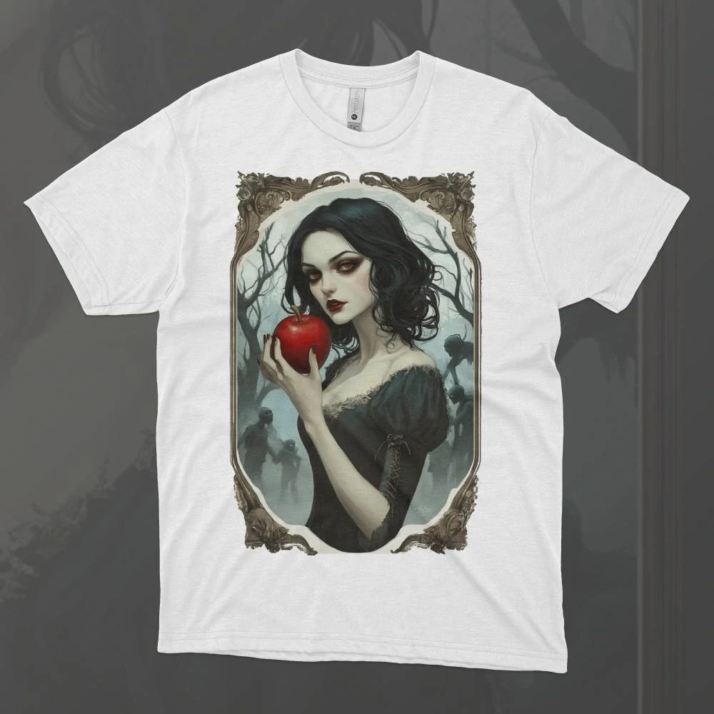 Sněhurka – Temné Jablko je tričko, které zobrazuje symbol pohádky s temnějším nádechem. Jablko, které v příběhu přináší smrtelný jed, je na tomto designu vnímáno jako objekt nebezpečné krásy, ukrývající záhubu v každém kousku. Temné odstíny a kontrastní barvy podtrhují nebezpečí, které toto jablko představuje, a jeho vztah k osudu Sněhurky. Tričko přetváří klasickou pohádku na tajemnou a hororovou verzi, v níž se zlo a krásná smrt splétají v jeden nezapomenutelný obraz.