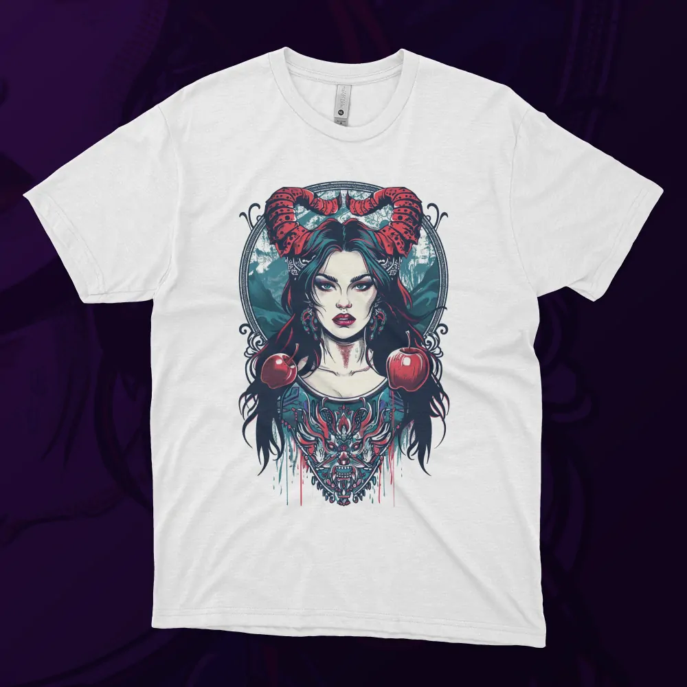 V zrcadle její komnaty se odráží chladný pohled, když Snow White Evil zírá na svůj odraz s temnou zášťou. Její ruka se stahuje ke kouzelnému jablku, které nese v sobě zkázu a lstivý plán. Toto tričko je portrétem temné královny, která se pohybuje mezi krásou a zlem, kde se setkává kouzlo pohádky s nevyzpytatelností temnoty. Oblečte se do této zbroje a připravte se na cestu do podsvětí pohádky, kde se odhalují nečekané pravdy a nekonečné tajemství.