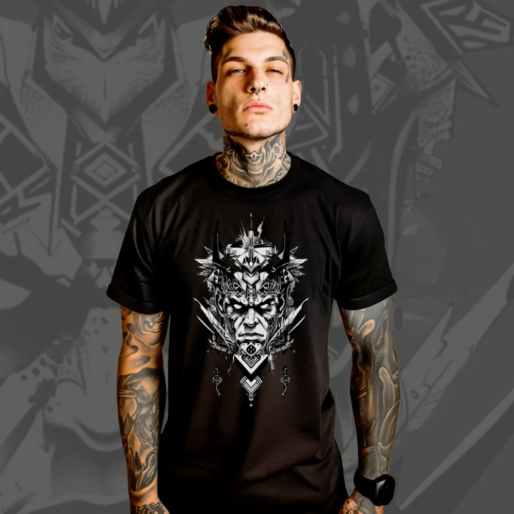 Spirit Shaman jako průvodce mezi světy, jehož hlas zní jako šepot větrů, neviditelně putuje mezi dimenzemi, propojujíc světlo a stín, aby našel rovnováhu v srdcích těch, kteří touží po poznání hlubin lidské duše a duchovního pochopení vesmíru. Šaman na tvém tričku.