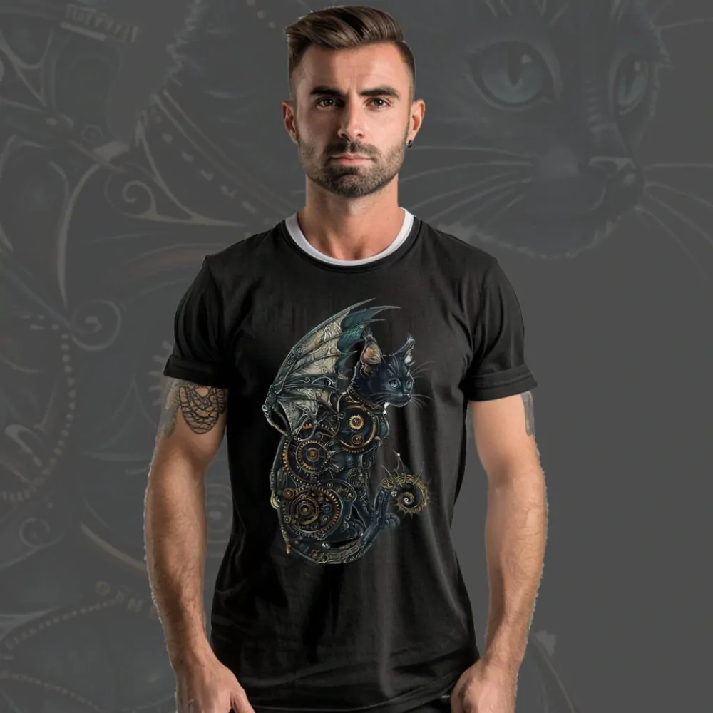 Představujeme vám tričko s názvem Steampunková kočka, které zachycuje tajemnou černou kočku ve steampunkovém stylu, ozdobenou ozubenými kolečky a elegantními křídly. Tato fascinující kočka, s pohledem plným inteligence a odhodlání, nosí mechanická křídla a detaily z kovu, které jí dodávají vzhled mechanického zázraku z alternativní viktoriánské éry. Představte si, jak Steampunková kočka proplouvá vzduchem nad městem plným parních strojů a inženýrských divů, její přítomnost vyzařuje jak mystiku, tak technickou inovaci. Toto triko je ideální pro všechny milovníky koček a steampunkového stylu, kteří chtějí do svého šatníku přidat kousek plný originality, dobrodružství a elegance. Přidejte si tento jedinečný kousek do svého šatníku a nechte se unést světem steampunku s touto okouzlující kočičí průzkumnicí.