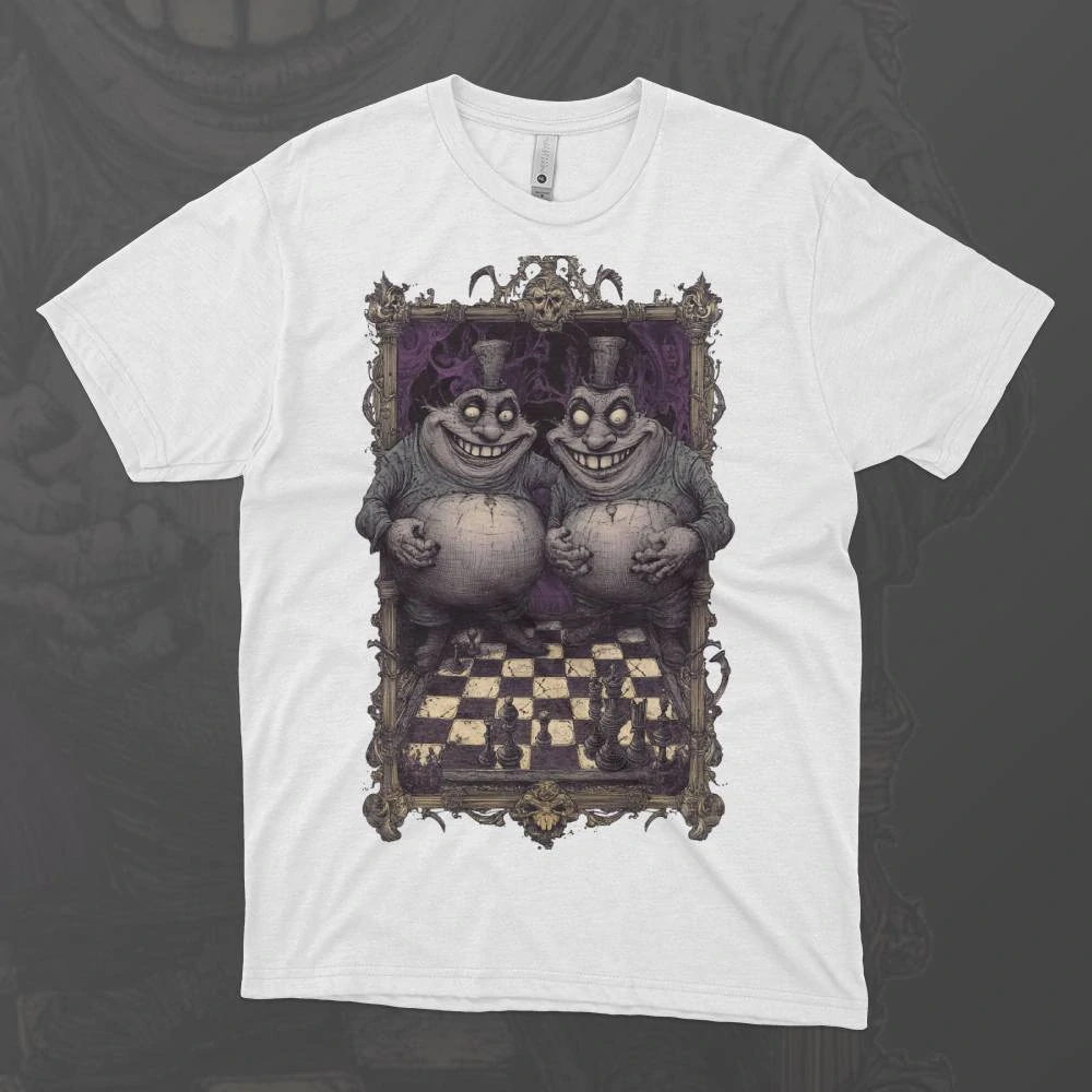 Tvídlíci – Tweedledee & Tweedledum jsou dvě postavy, které svou vzájemnou podobností, ale i neustálým hádáním se, přinášejí do říše divů komický chaos. Tito zábavní dvojčata jsou nezastavitelným zdrojem vtipu a absurdit, kdy jejich neustálé spory o maličkosti vytvářejí neuvěřitelný zmatek. Tričko s tímto motivem je ideální pro každého, kdo má rád humor a dvojice, které se navzájem doplňují svými kontrastními, ale přesto komickými charakteristikami. S Tvídlíky na sobě přinesete do svého života nádech lehkosti a humoru, který je jako stvořený pro ty, kteří se rádi smějí životním malým nejasnostem.