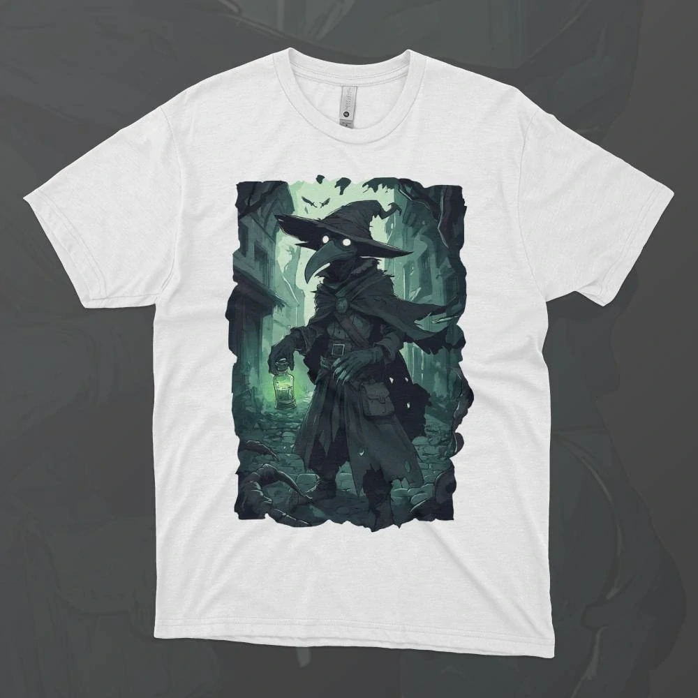 Ztracený Doktor – Plague Doctor je tričko, které zobrazuje morového lékaře v osamělém putování temným a opuštěným světem. Jeho postava je zahalena do pláště, jehož dlouhé špičky se ztrácejí v mlze, jako by se pomalu ztrácela i samotná naděje. Tento design evokuje pocit ztráty a zoufalství, kdy i ten, kdo má přinést uzdravení, se stává součástí temné apokalypsy. Ztracený Doktor je pro ty, kteří cítí spojení s tajemnými příběhy o ztrátě, izolaci a neodvratné zkáze, kde i lékař, symbol naděje, je na okraji ztráty víry a vlastní identity.