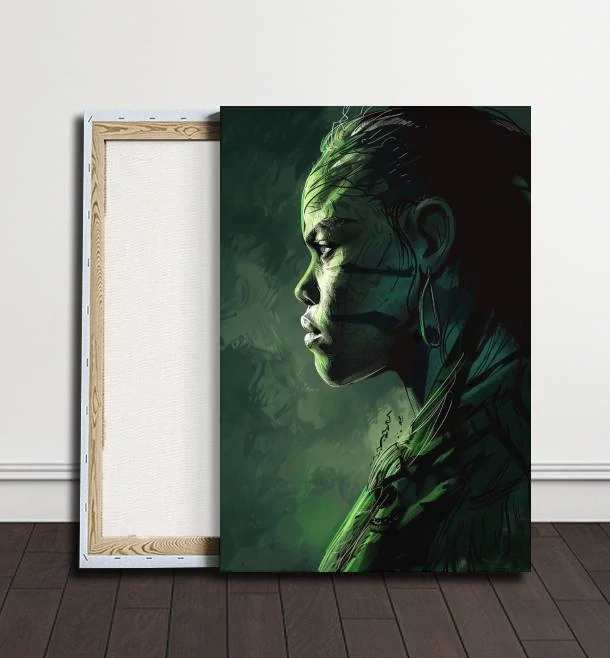 Kmenová lovkyně v ženské variantě symbolizuje moudrost a schopnost přežít v náročném prostředí. Její oči vyzařují soustředěnost a sílu. Pro ideální doplnění se podívejte na mužskou variantu, která přináší do páru divokou energii a nezkrotnou sílu.