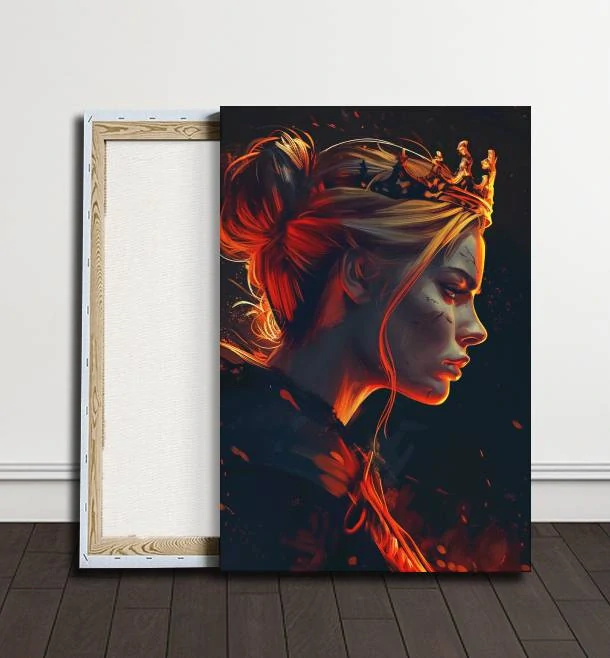 Královna je symbolem moudrosti, síly a elegance. Její pohled je rozhodný, ale plný něžnosti. Tento obraz skvěle doplňuje mužskou variantu, která vnáší do páru moc a autoritu s přidaným majestátním nádechem.