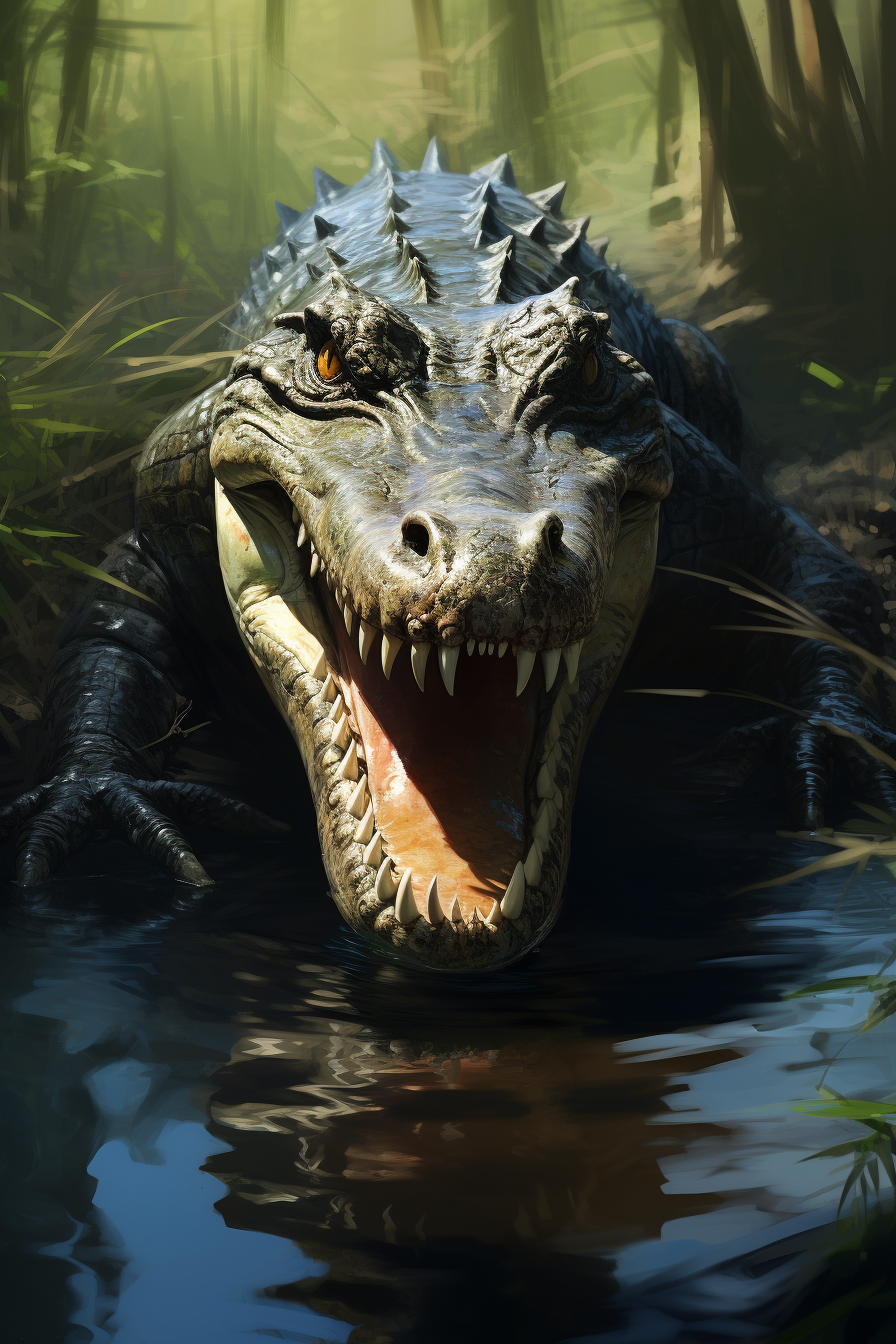 Aligátor rozpíná svou mohutnou tlamu podél vodní hladiny, zatímco zvuk jeho skřeku rezonuje v okolním lese. Vznešenost džungle je zvýrazněna kontrastem mezi pohlcující zelení a bestiální silou tohoto zvířecího vládce.