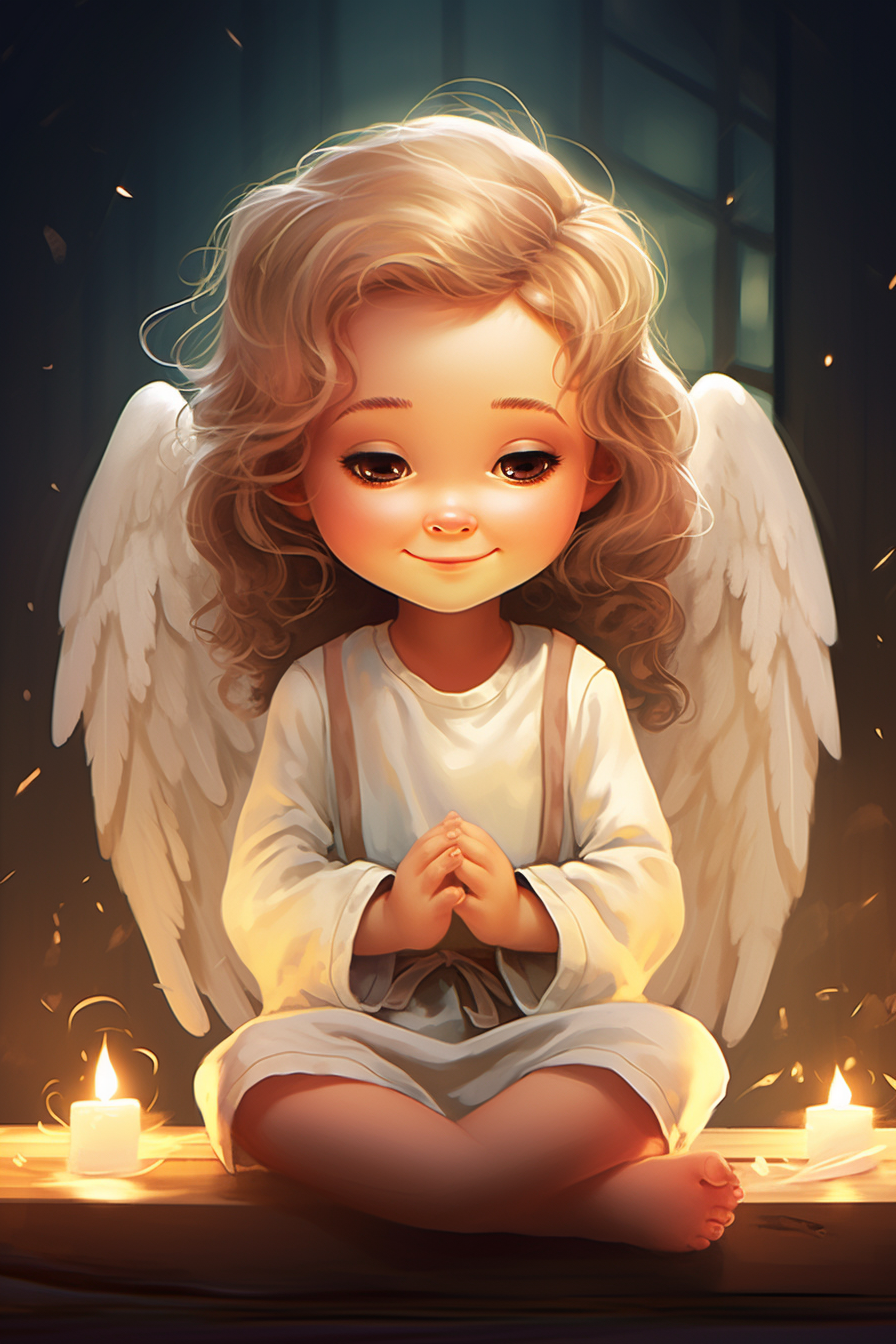 Tento obraz zachycuje klidný a mírový moment anděla v modlitbě, osvíceného jemným světlem svíček. Ideální pro přidání atmosféry klidu a pokoje do vašeho domova nebo pracovního prostoru.