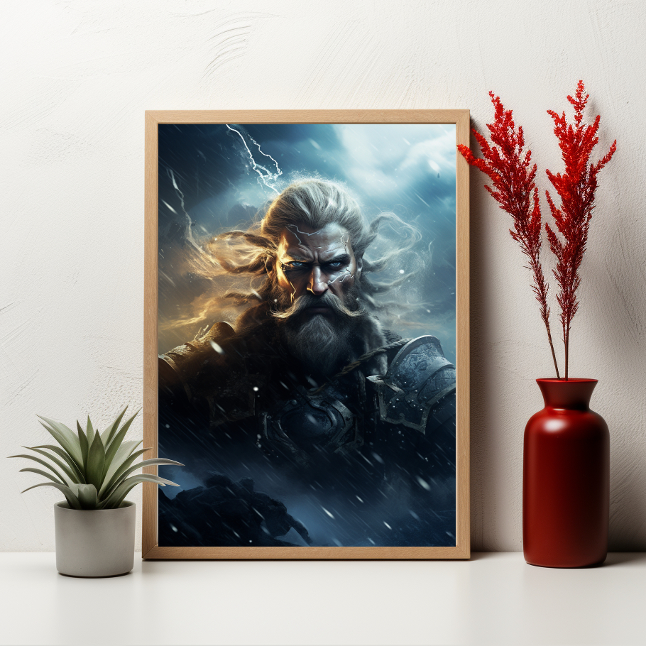 Vikingský bojovník v brnění drží meč a čelí bouři. Jeho obličej je rozmazaný, aby se zachovala jeho identita. Jeho blond vlasy vlají ve větru. Na pozadí jsou tmavé mraky, blesky a déšť. Bojovník stojí na skalnatém útesu.