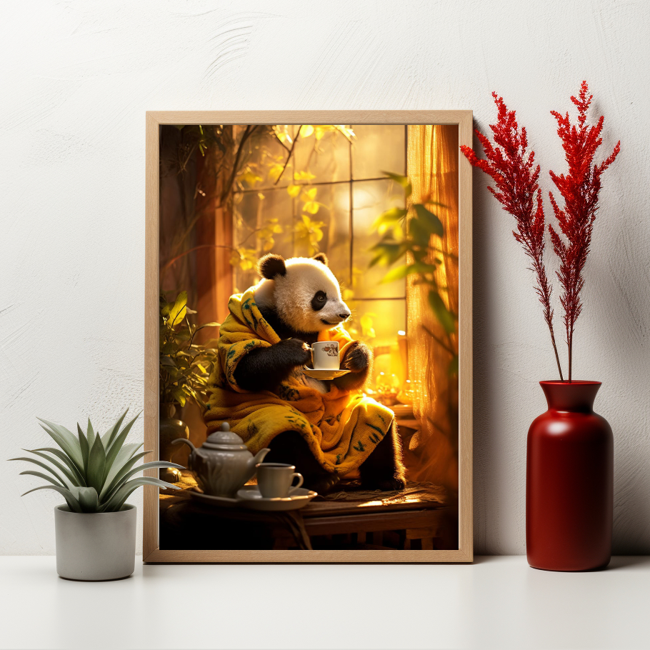 V této roztomilé dětské malbě sedí veselá panda v županu, která si pochutnává na čaji. Tato hravá scéna přináší dojem zábavy a fantazie, kdy se pandí kamarád stává součástí dětských příběhů a dobrodružství.
