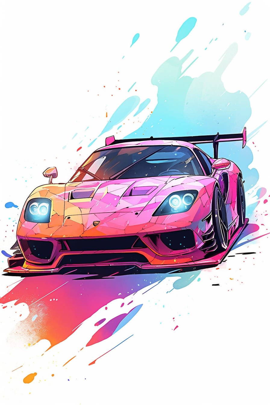 Malované červené auto se prohání před námi jako výraz vášně a rychlosti, s bílým pozadím, které vytváří živý a dynamický kontrast. Tento obraz představuje sílu a vzrušení jízdy, která probouzí naše smysly.