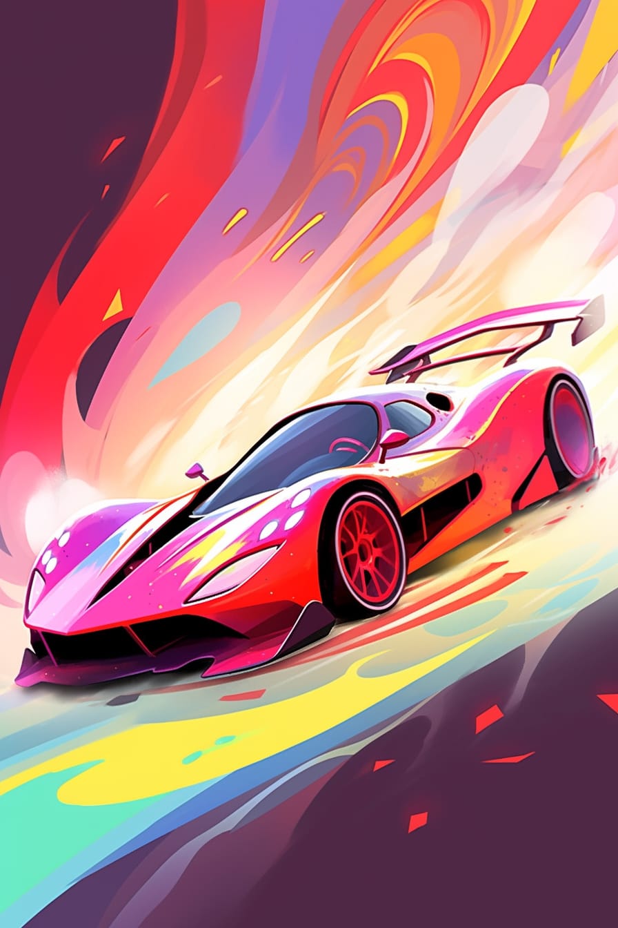 Malované červené auto vystupuje jako výraz vášně a energie na pozadí pestrobarevného kaleidoskopu. Tento obraz je plný života a odvážně kombinuje sílu automobilového designu s bohatstvím barev a vzorů okolního prostředí.