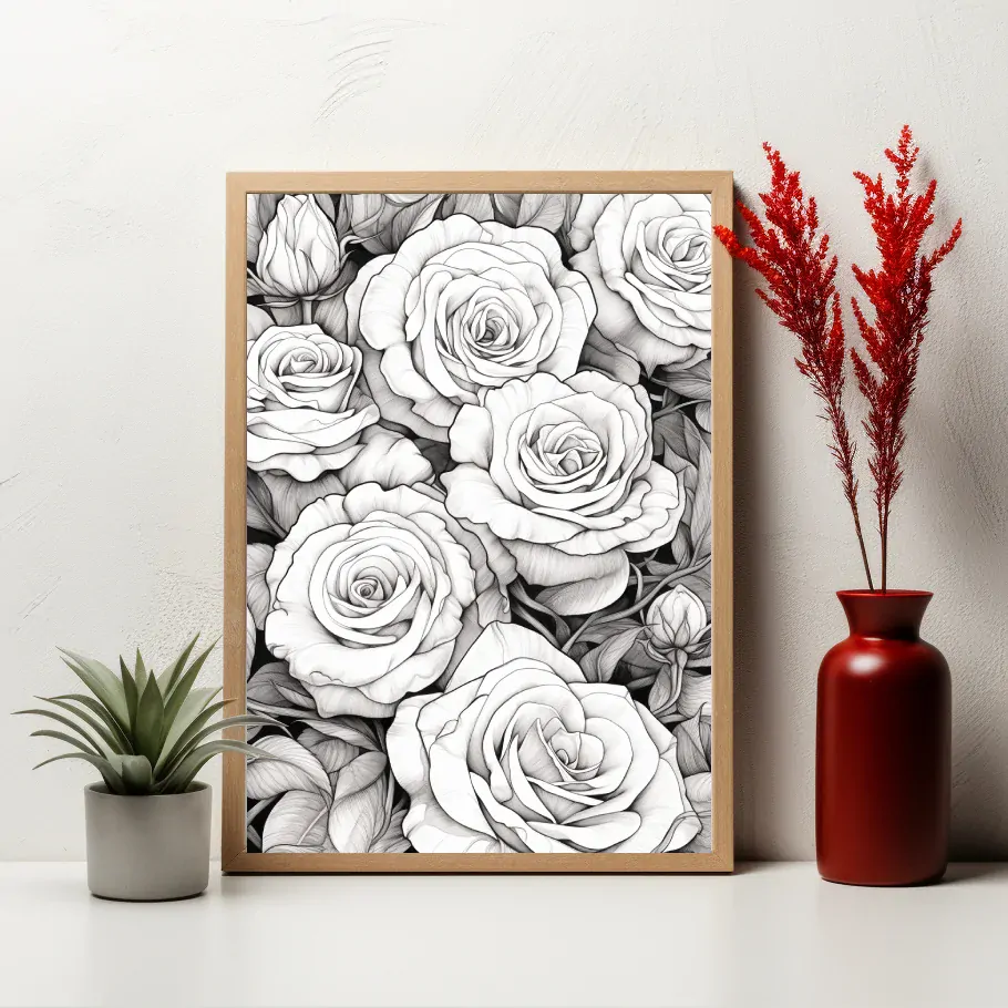 Na něžném bílém pozadí tančí černobílé růže s neodolatelnou elegancí. Kontrastní kombinace barev zdůrazňuje krásu každého květu a vtahuje diváka do světa nevšedního klidu a krásy. Obraz vyzařuje noblesu a sofistikovanou jednoduchost, která okouzluje a inspiruje.