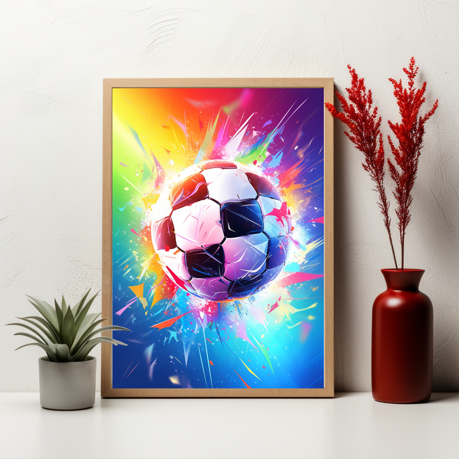 Barevný portrét fotbalového míče zachycuje jeho dynamiku a sílu skrze živé barvy, které vyvolávají pocit radosti a vzrušení, jenž se plíží při každém dotyku s tímto ikonickým sportovním symbolem.