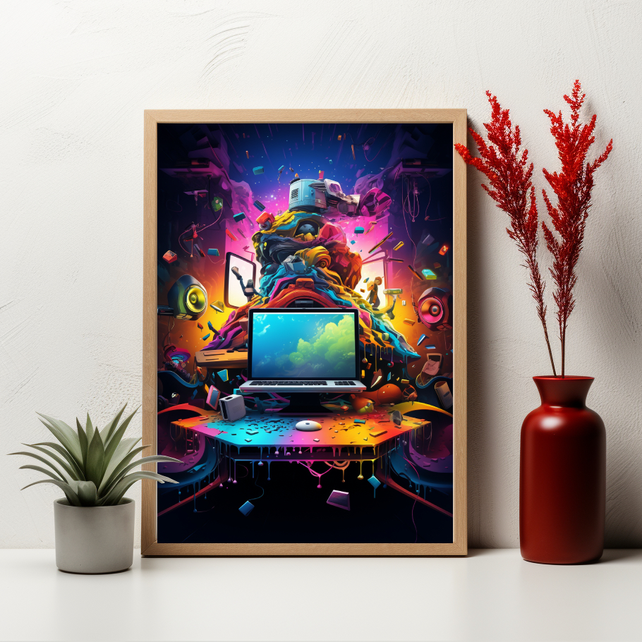 Tento jedinečný obraz, plný živých barev a dynamických prvků, ztělesňuje explozi kreativity a inovace. Ideální dekorace pro moderní kanceláře nebo pracovní prostory, které chtějí inspirovat tvořivost a inovaci.