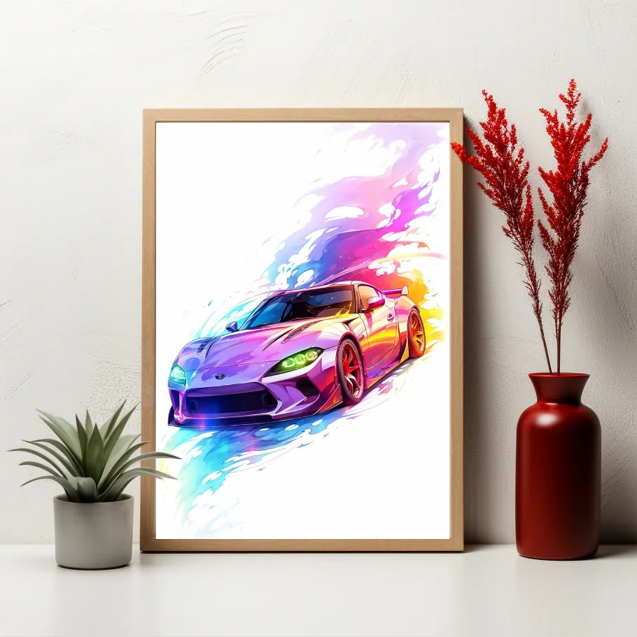 Elegantní fialové auto s plameny ve stejné barvě tančí nad klidným bílým pozadím, zářícím ve svém vlastním světle.