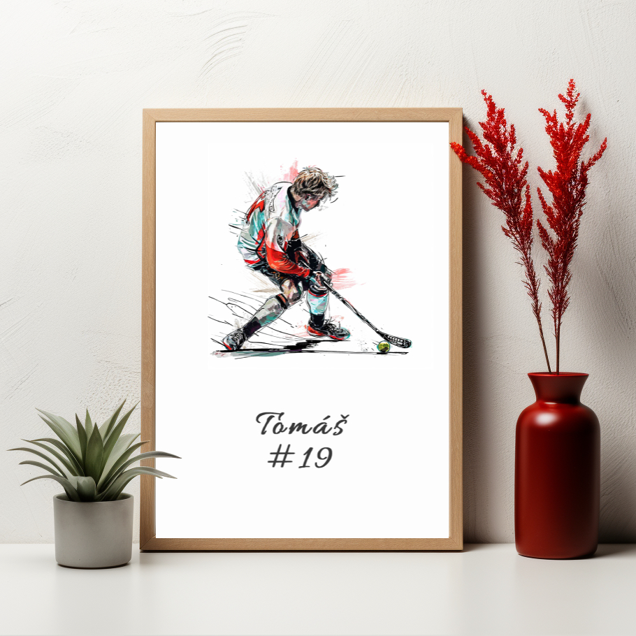 Oslavte své osobní úspěchy nebo milníky s tímto jedinečným plakátem, který vám umožní přidat vlastní text, jméno nebo číslo, a udělat tak každý kus osobním a výjimečným. Plakát zobrazuje florbalistu a je doplněn o rukopisný text “Tomáš#19”, který může být nahrazen vaším vlastním textem.