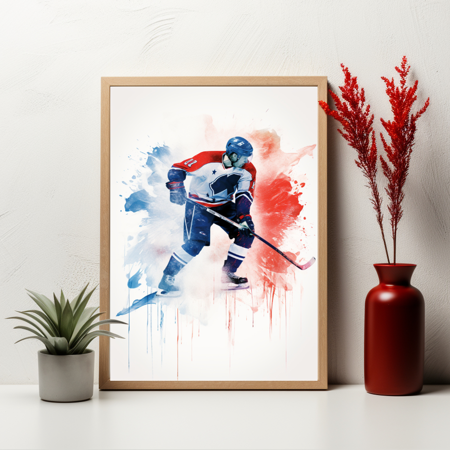 Tento jedinečný a expresivní plakát zachycuje hokejistu v akci, obklopeného dynamickými stříkanci barvy. Ideální pro milovníky sportu a umění, tento plakát přinese energii a vášeň do jakéhokoliv prostoru.