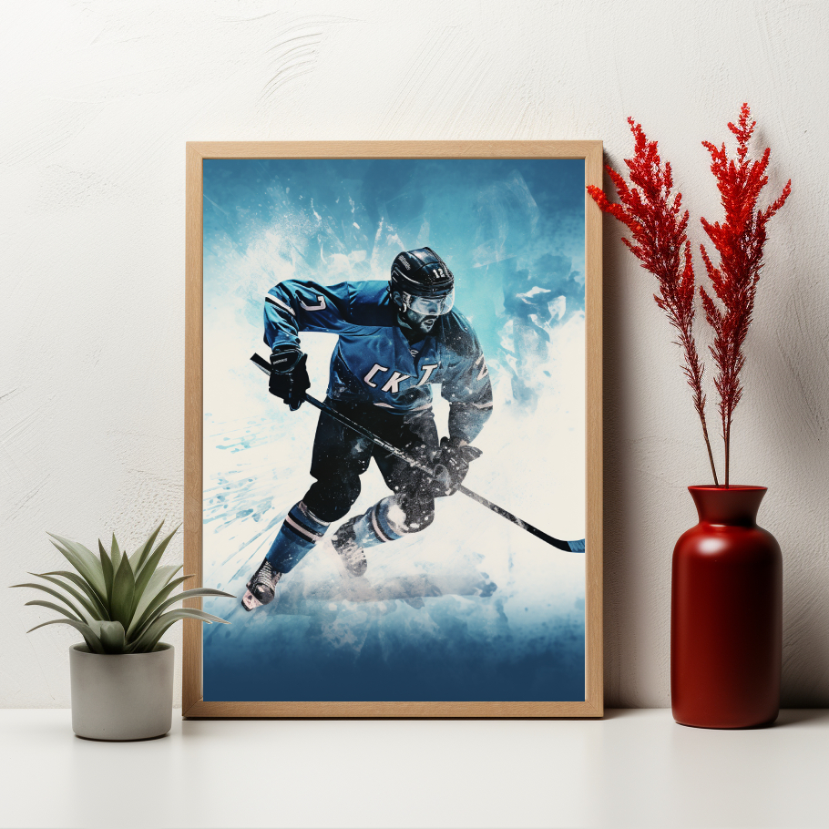 Tento dynamický plakát zachycuje hokejistu v akci, obklopeného výbuchem barev symbolizujících energii a vášeň pro hru. Ideální dekorace pro milovníky sportu, kteří chtějí přinést kousek akce a dynamiky do svých prostor.