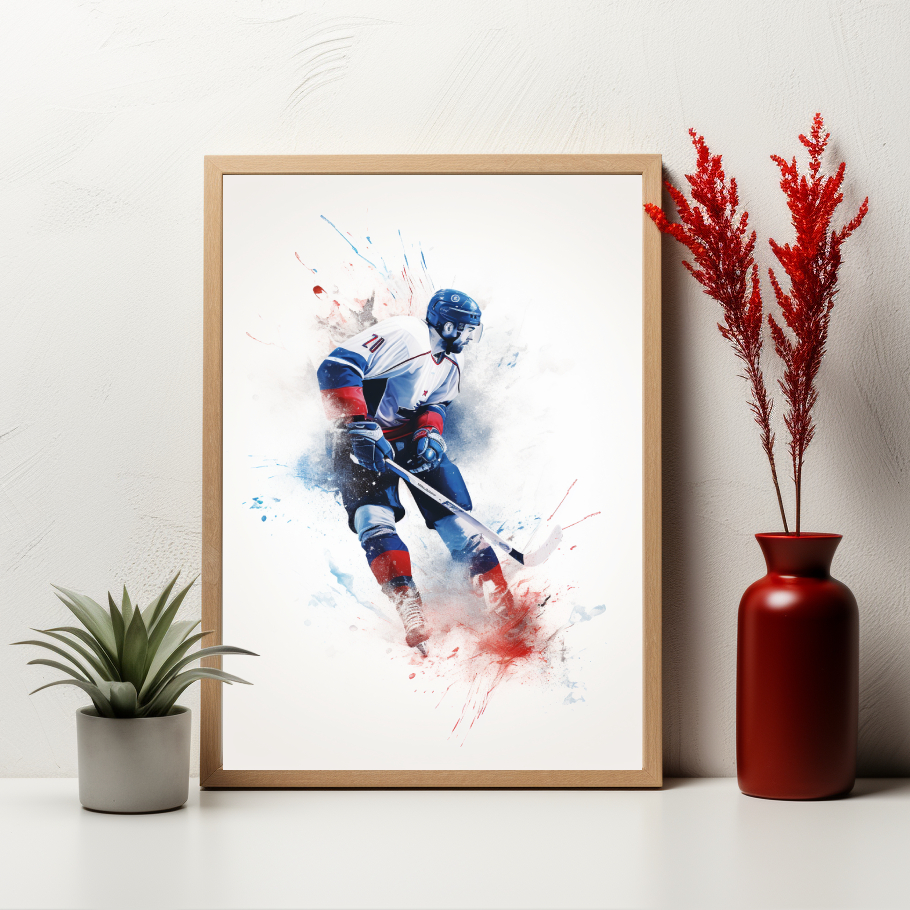 Tento dynamický plakát zachycuje okamžik hokejového hráče v akci, obklopeného výbuchem barev symbolizujících energii a vášeň pro hru. Ideální dekorace pro milovníky sportu, kteří chtějí přinést kousek akce a dynamiky do svých prostor.