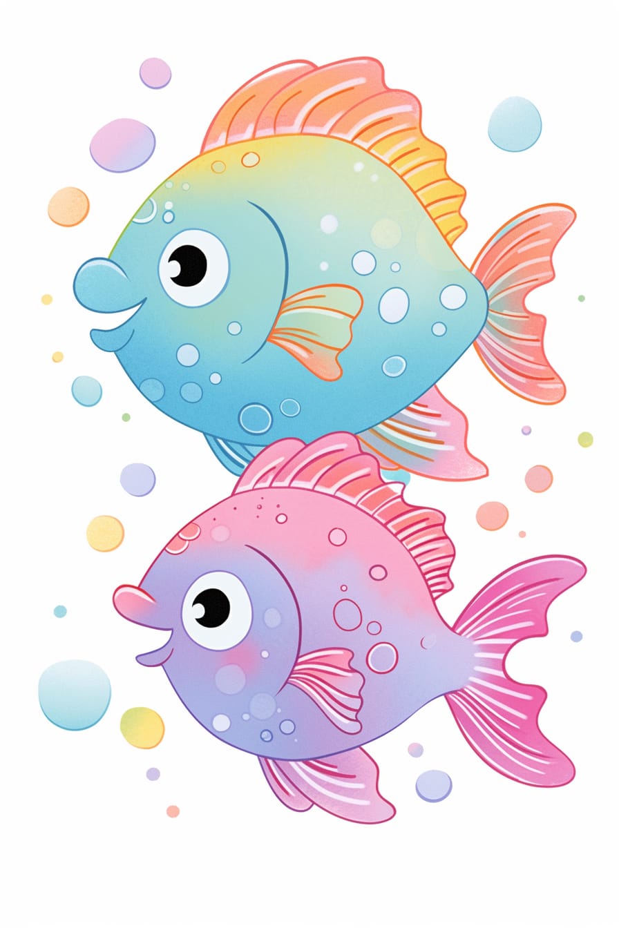 Dvě hravé barevné rybičky se proplétají ve vzduchu na čistém bílém pozadí, jako by tančily ve vodním světě snů, přinášející pocit lehkosti a radosti do prostoru.