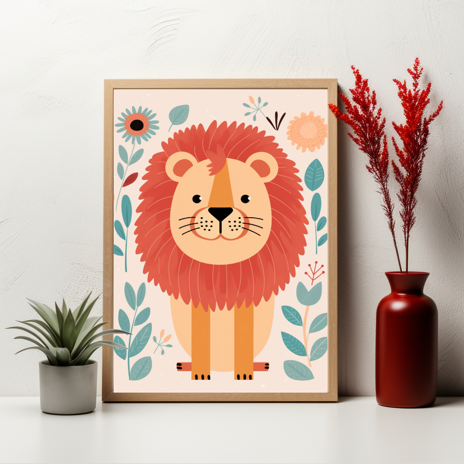 Dětský lev si hraje mezi rozkvetlými loukami a nadechnutím vdechuje krásu přírody, jeho hravost a nevinnost oživuje krajinu.