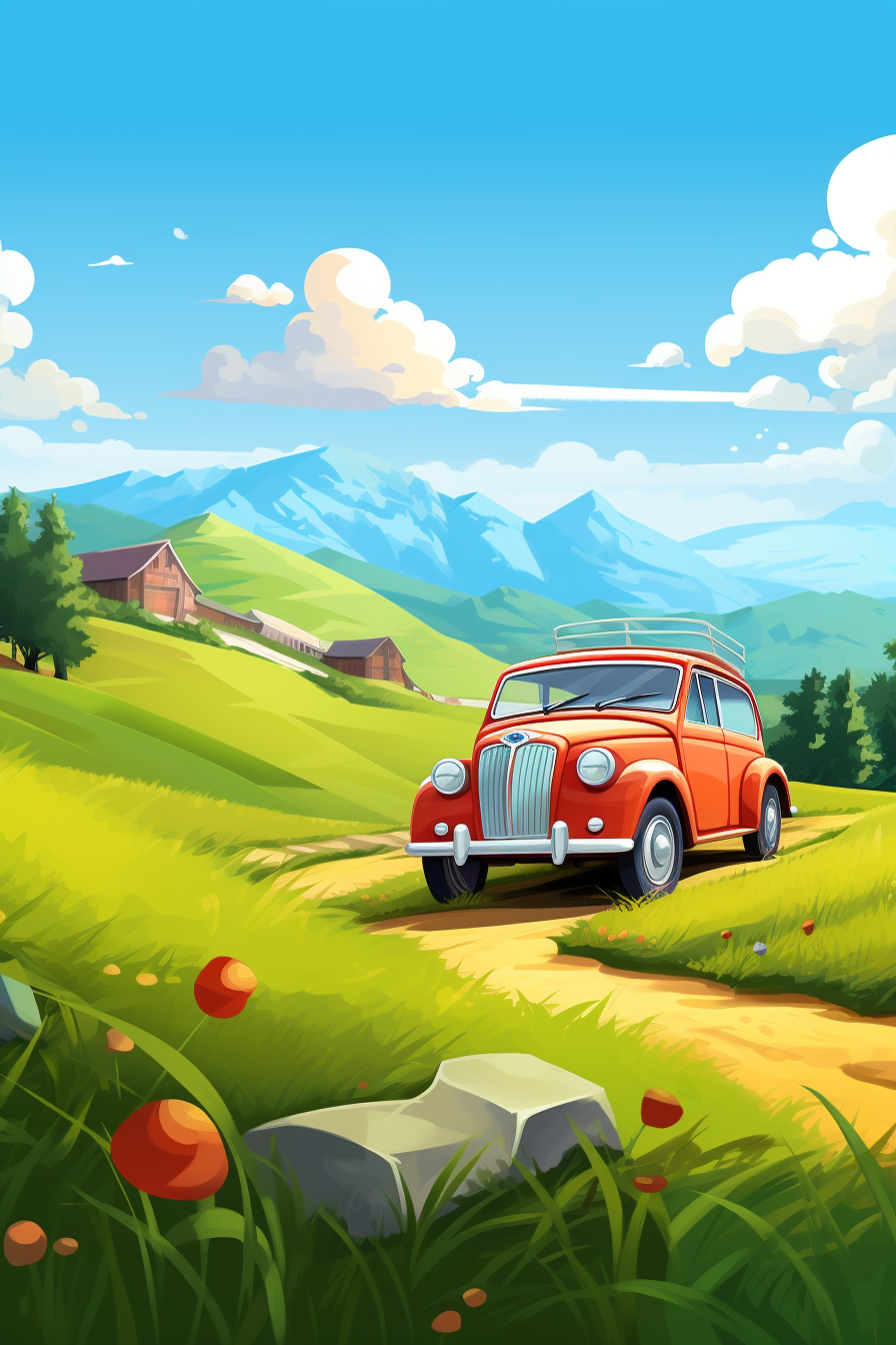 Červené auto jede po prašné cestě zelenou krajinou. Auto je staršího modelu s bílou střechou a nosičem na střeše. Celková nálada obrazu je klidná a idylická.