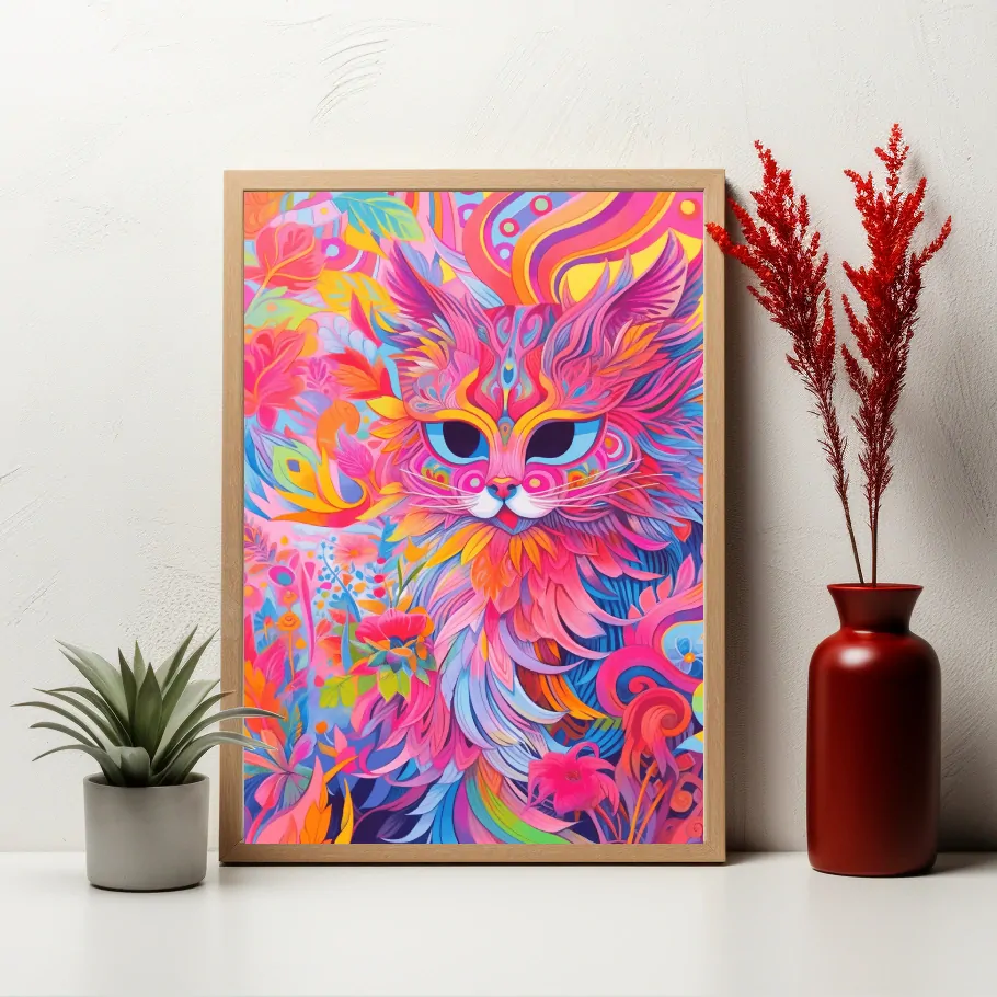 Tento obraz je hravým ztvárněním kočičích pohybů a zvědavosti. Skrze abstraktní formy a hravé barevné kombinace vytváří atmosféru lehkosti a radosti, která evokuje hravost kočičího světa.