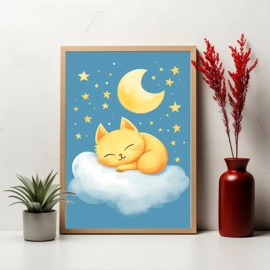 Malá kočička s měkkou srstí, která si odpočívá na pusinkově růžovém obláčku, zatímco nad ní svítí jasný měsíc a hvězdy jí ukazují cestu ke snovému dobrodružství.