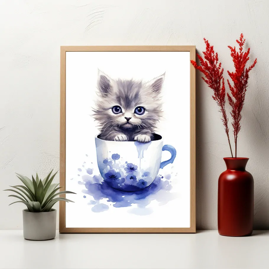 V této roztomilé dětské malbě se nachází malá kočička, která si vybrala květinový hrníček jako svůj útulný domov. S úsměvem na tváři sleduje okolní svět z tohoto malého ráje plného barevných květin, přinášejících do obrazu radost a hravost.