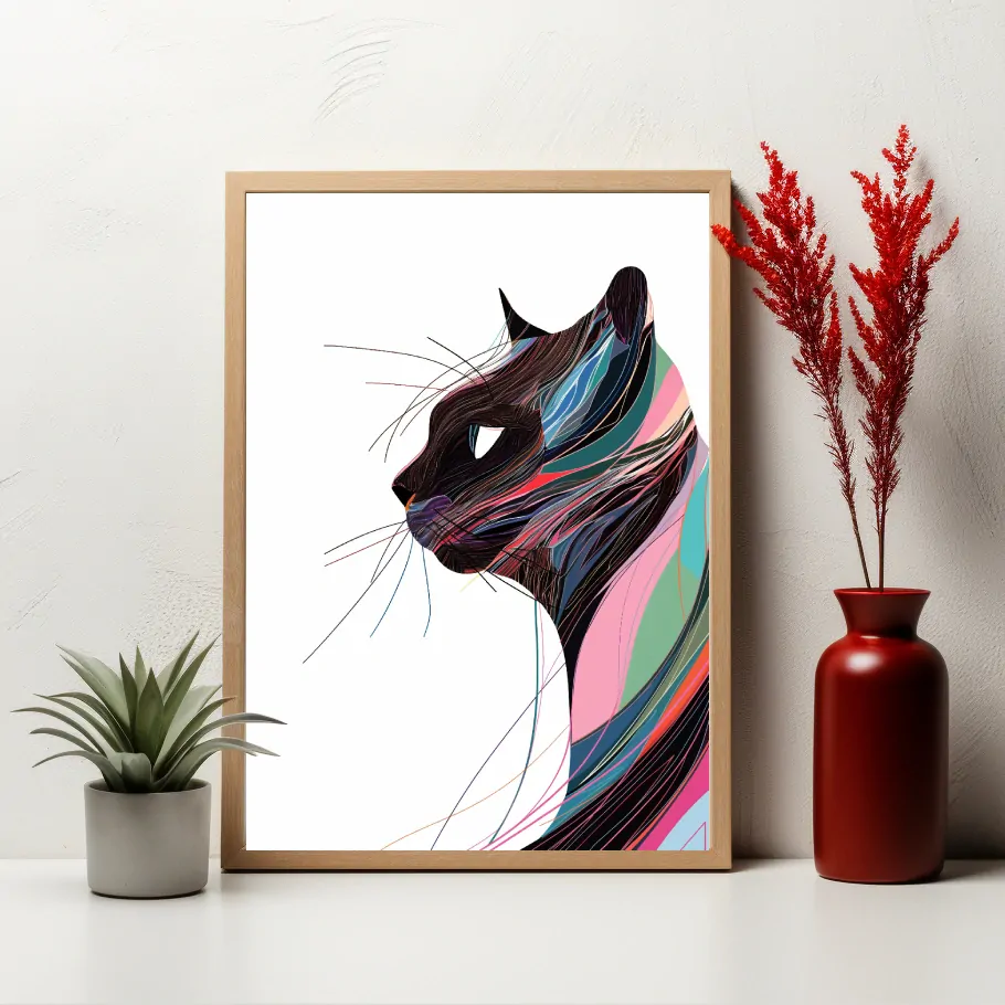 Abstraktní obraz s vírem barev a pohybem, který představuje kočku v plném rozkvětu energie a života.