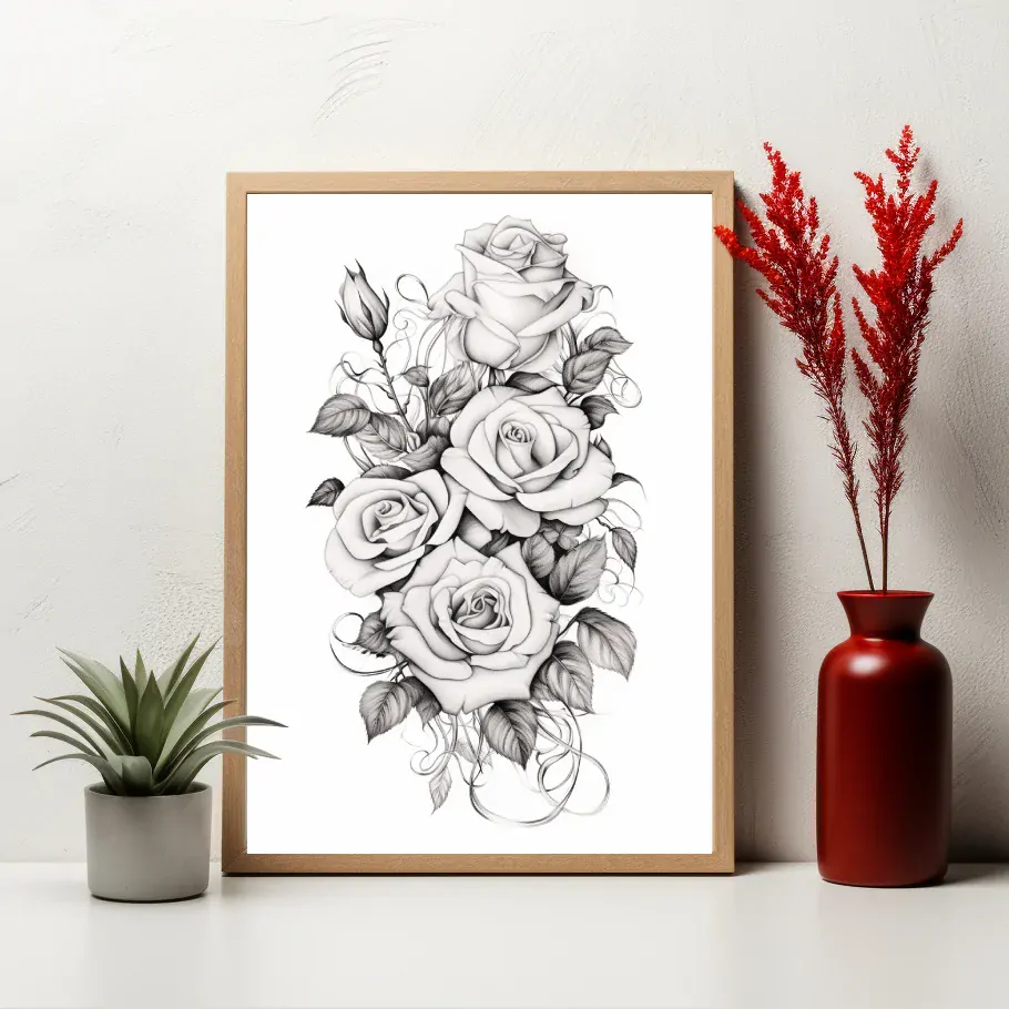 Černobílé růže na bílém pozadí tvoří kontrastní krásu, která okouzluje a provokuje. Jednoduchost barev zdůrazňuje krásu samotných květů, jako by vystupovaly ze zvýrazněného pozadí. Obraz přináší jedinečnou perspektivu na květinové umění, kde harmonie černobílých odstínů vyvolává vzácný estetický zážitek.