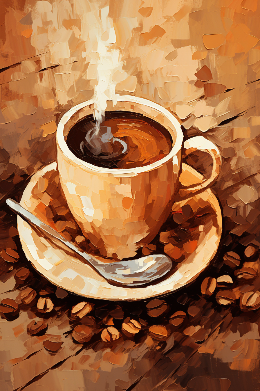 Horká káva se vznáší nad hrníčkem a vytváří smyslný kouř, který láká na okamžik zážitku. Na talířku kolem hrníčku se rozprostírají lahodná zrnka kávy, která slibují bohatou chuť a vůni. Obraz láká na příjemný moment klidu a požitku.