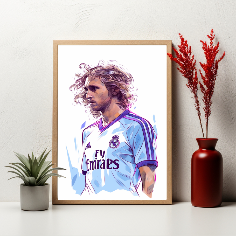 Tento plakát přináší Luka Modriće jako mistra elegance na fotbalovém hřišti. Jeho precizní technika, vize a mistrovské středy jsou zhmotněny v této limitované edici, která uchovává jeho odkaz mezi fotbalovými legendami.