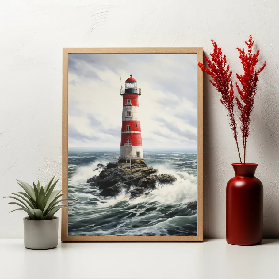 Červenobílý maják vztyčuje svou postavu na útesu, jehož nohy obmyšlené rozbouřenými vlnami moře. Modré nebe na obzoru dotváří harmonii s mohutností oceánu. Obraz zachycuje majestátnost a sílu přírodních prvků, zatímco maják slouží jako záchranná hvězda pro mořeplavce. Pocit klidu a bezpečí přináší nám tento pohled na maják, který se tyčí nad nekonečným mořem.