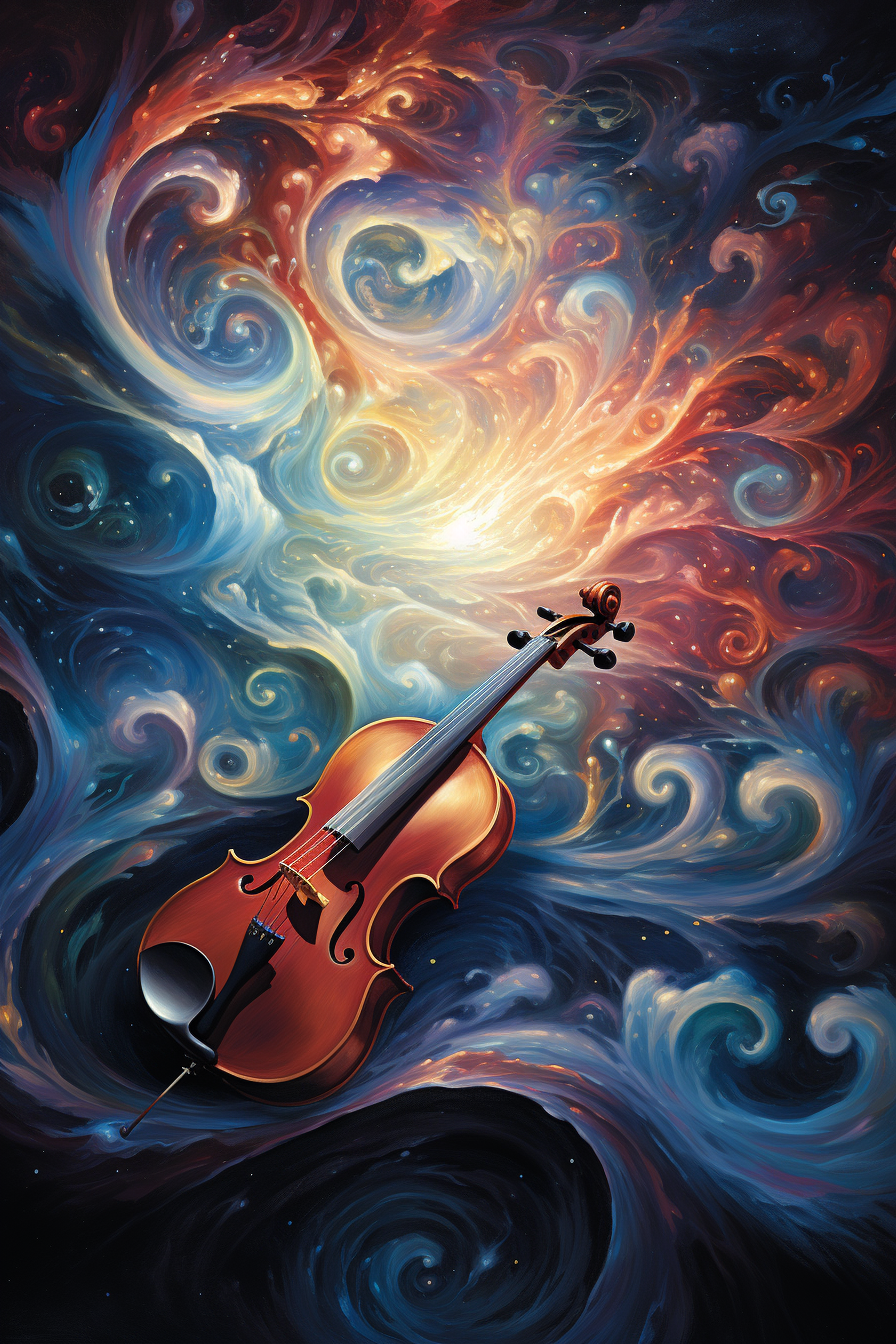 Housle se vznášejí v abstraktním kaleidoskopickém prostoru, kde barevná paleta harmonicky tančí s každým tónem, vytvářejícím jedinečnou symfonii vizuálního umění.