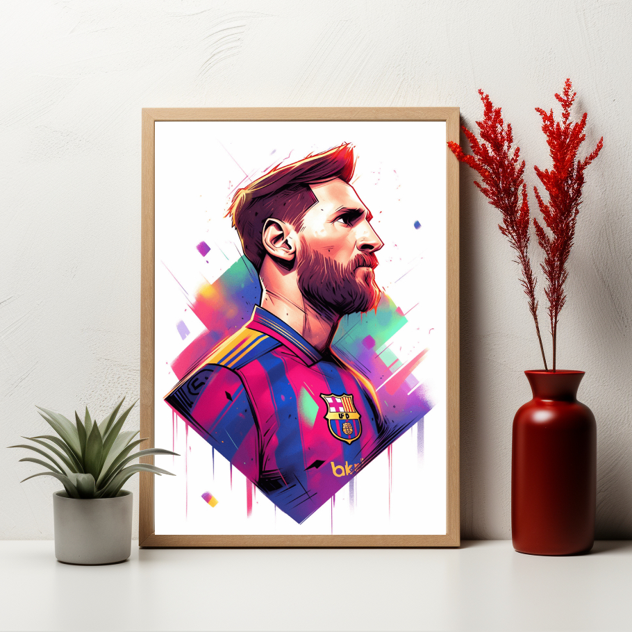 Portrét Lionela Messiho je jako exploze barev a kreativity. Jeho tvář je zobrazena s intenzivním výrazem, který odráží jeho neuvěřitelnou techniku a brilantnost. Živé barvy vytvářejí dojem dynamiky a pohybu, zatímco detaily zdůrazňují jeho preciznost a mistrovství. Tento obraz je poctou jednomu z nejtalentovanějších fotbalistů v historii.