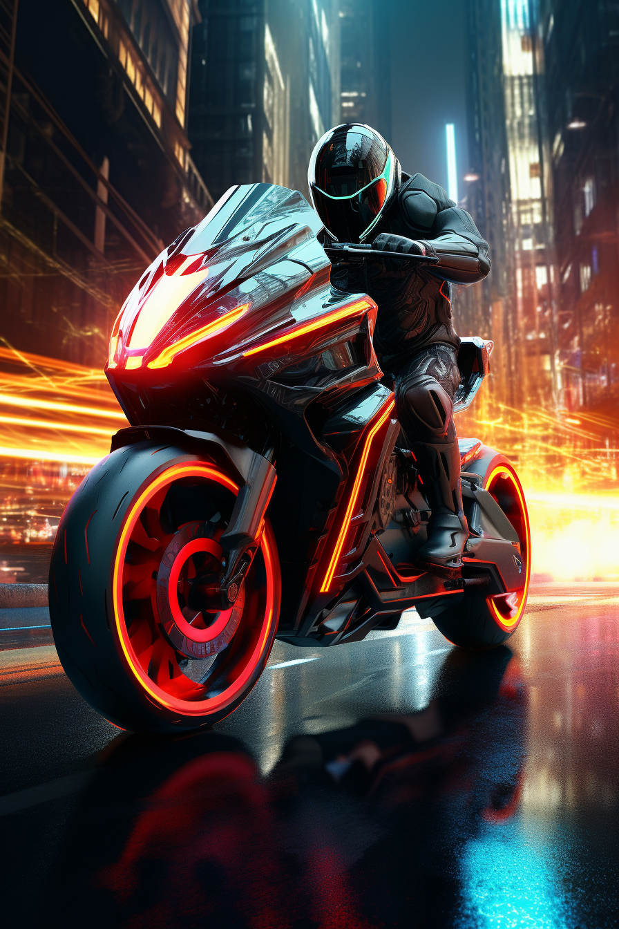 Černá motorka se propojuje s městem v harmonickém tanci rychlosti. Zcela pohlcený svým strojem se stává součástí moderního městského života.