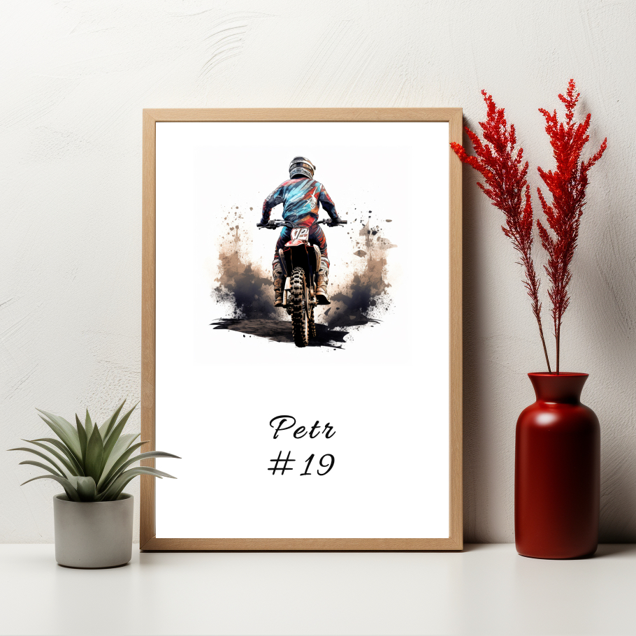 Oslavte své osobní úspěchy nebo milníky s tímto jedinečným plakátem, který vám umožní přidat vlastní text, jméno nebo číslo, a udělat tak každý kus osobním a výjimečným. Plakát zobrazuje motokrosaře a je doplněn o rukopisný text “Petr#19”, který může být nahrazen vaším vlastním textem.