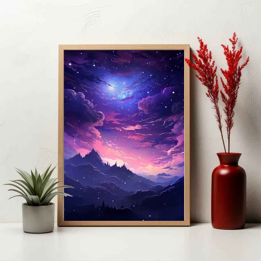 Obraz zachycuje oblohu plnou tajemství a lesku hvězd, které nás přitahují svým neodolatelným půvabem a drží nás v jejich nebeském objetí.