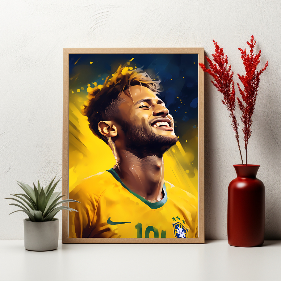 Neymar vládne fotbalovému hřišti jako pravý král. Jeho pohled je plný sebedůvěry a rozhodnosti, což ho činí nepřemožitelným na hřišti.