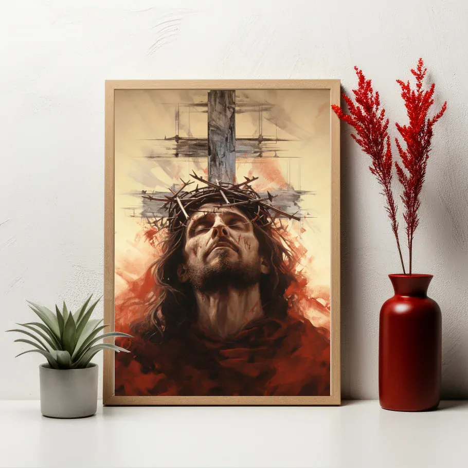 Na obraze je zobrazen Ježíš, který nese kříž na svých bedrech, připravený obětovat se pro záchranu lidstva. Jeho tvář vyzařuje soucit a statečnost. Kříž v pozadí symbolizuje břemeno a oběť. Obraz přináší pocit úcty a pokory vůči jeho lásce a obětavosti.