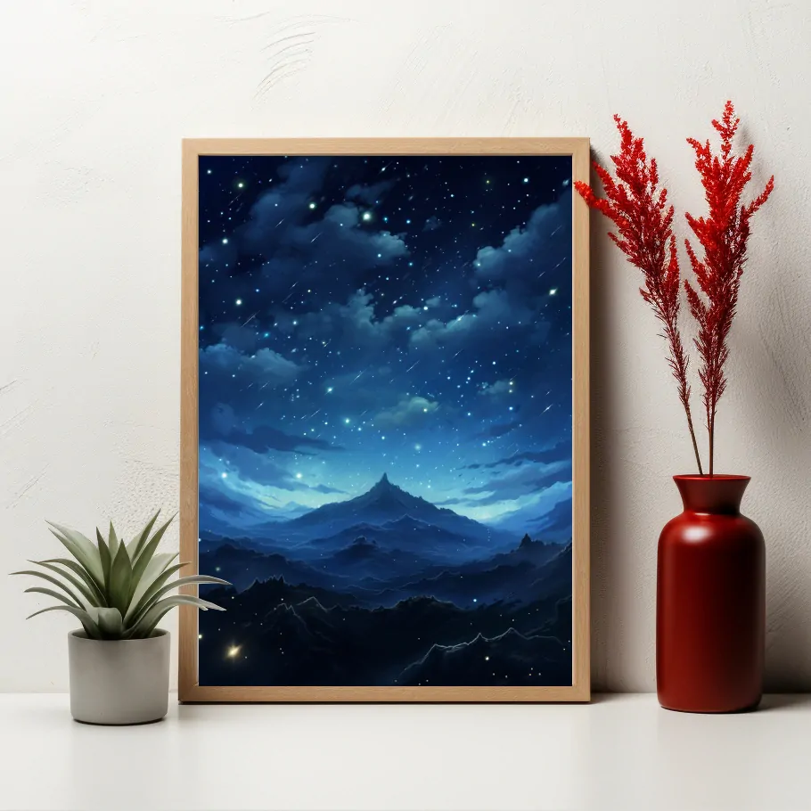 Obraz zachycuje oblohu v odstínech modři, která evokuje klid a mír, zatímco hvězdy jemně třpytí na jejím pozadí.