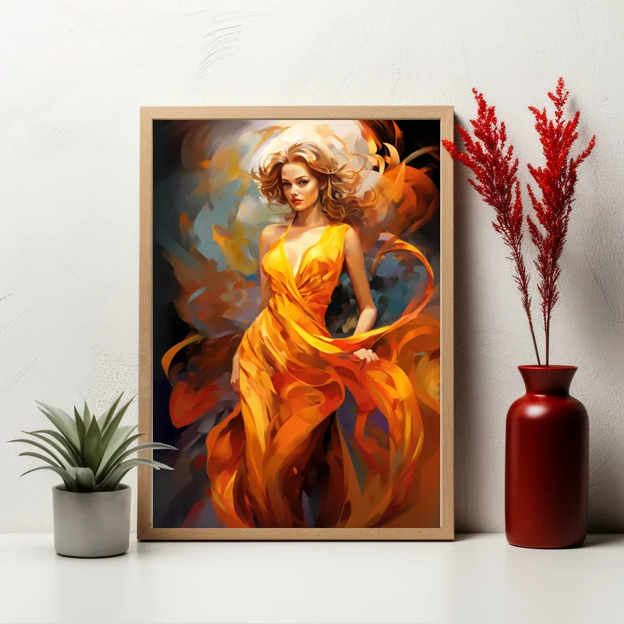 Tento digitální obraz je podobenstvím ženy v pohybu. Obraz zobrazuje ženu v oranžových šatech, které jsou plné látky a stužek. Ženin obličej je rozmazaný, aby se uchovala její anonymita. Pozadí je složeno z modrých a bílých vírů, které dodávají obrazu nádech fantazie. Obraz má malířský styl, se znatelnými tahy štětce a texturou. Tento obraz je určen pro ty, kteří mají rádi umění a pohyb.