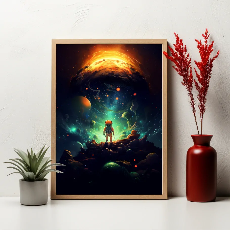 Astronaut se potápí do ticha vesmíru, osamělý cestovatel mezi hvězdami. Měsíc jako věrný průvodce na obloze ho doprovází na jeho dobrodružství. Obraz vyvolává pocit tajemna a neznáma, které skrývá kosmos.